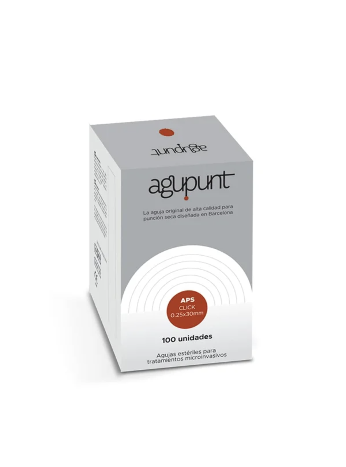 Las agujas de punción seca Agupunt tipo click incorporan tubo guía y un sistema de fijación mediante una pequeña gota de silicona que une la aguja al aplicador, facilitando el agarre y mejorando el control durante la manipulación.