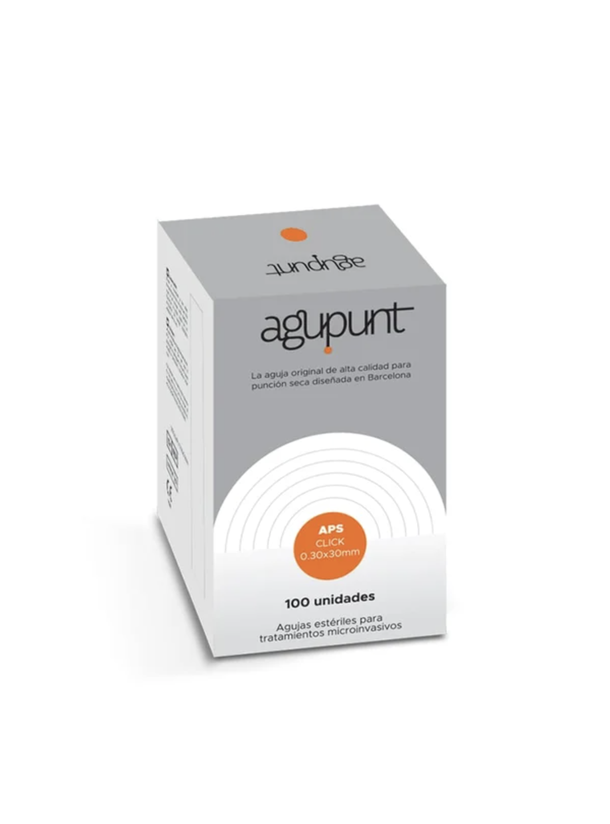 Las agujas de punción seca Agupunt tipo click incorporan tubo guía y un sistema de fijación mediante una pequeña gota de silicona que une la aguja al aplicador, facilitando el agarre y mejorando el control durante la manipulación.