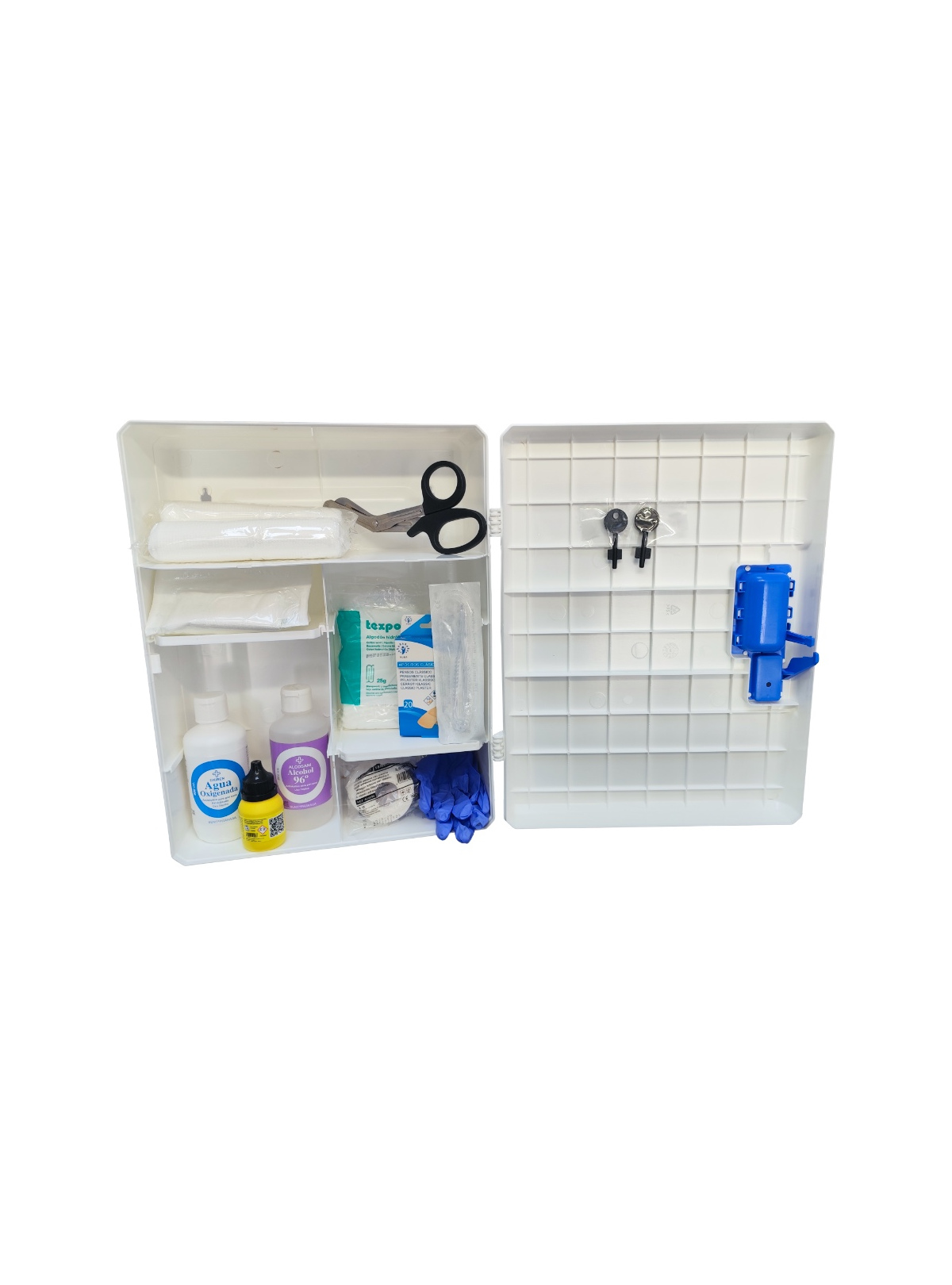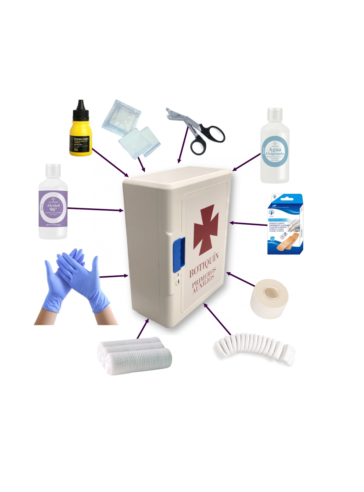 El botiquín se suministra completamente equipado con una selección de productos esenciales para la atención de primeros auxilios, lo que lo convierte en una opción lista para su uso desde el primer momento.