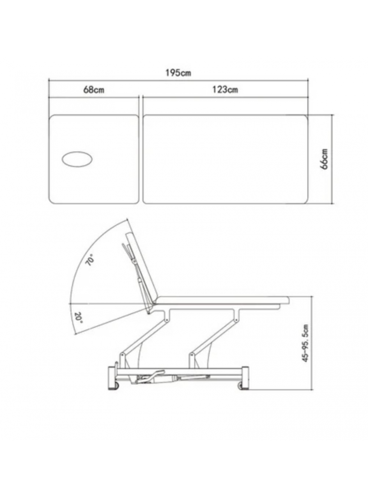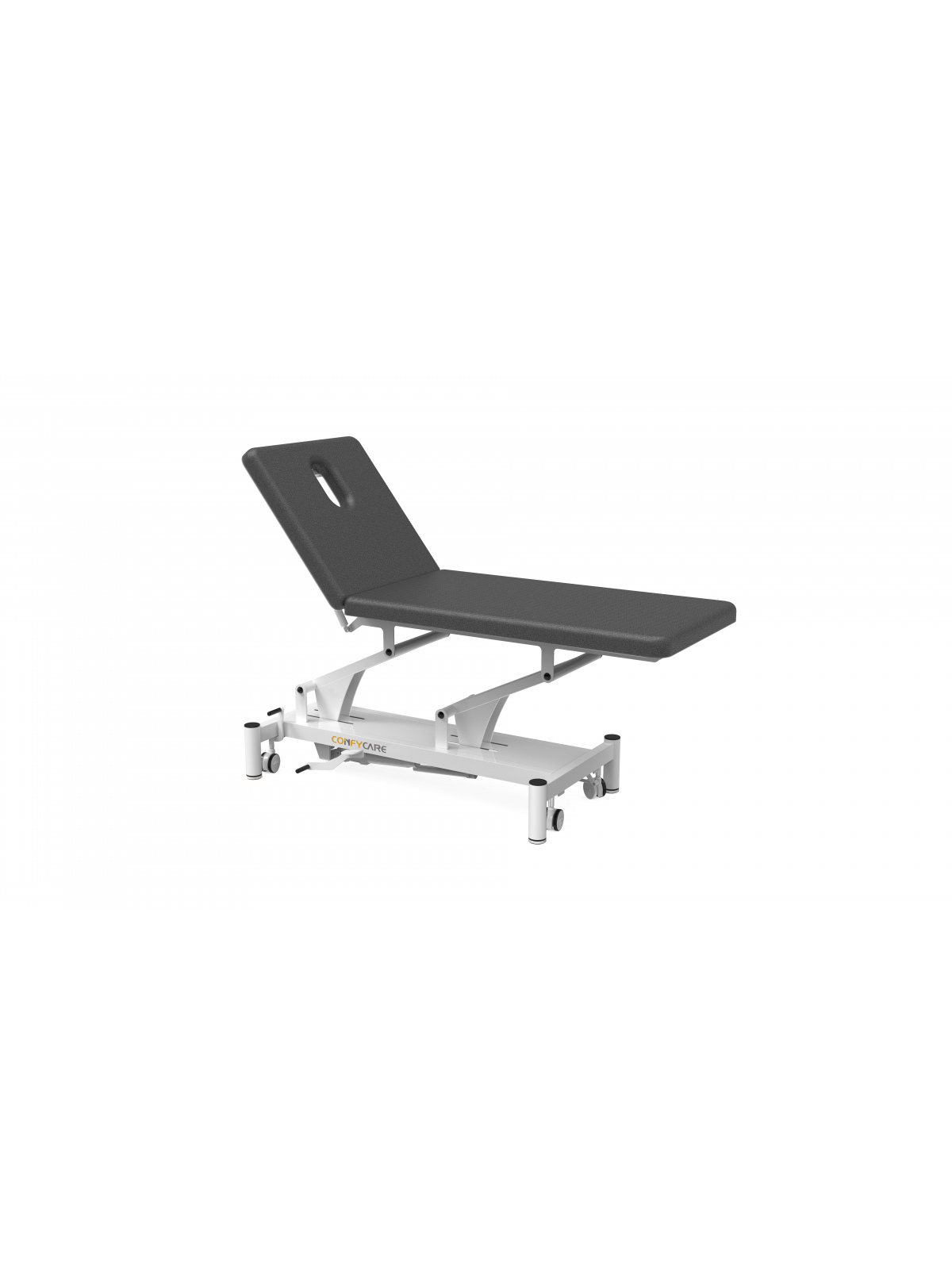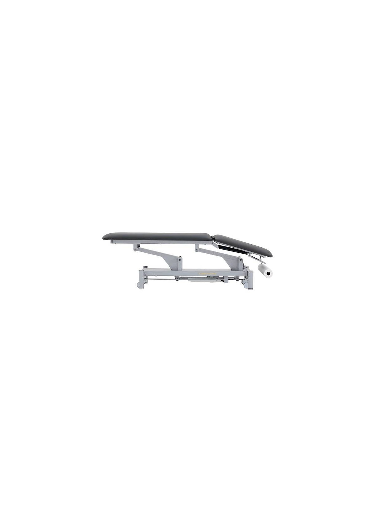 Camilla hidráulica profesional de dos secciones, diseñada para tratamientos intensivos en fisioterapia. Su estructura robusta, el ajuste de altura mediante sistema hidráulico y el respaldo con agujero facial la convierten en una opción segura, cómoda y duradera. Disponible con estructura blanca o gris y tapizado exclusivo en gris.