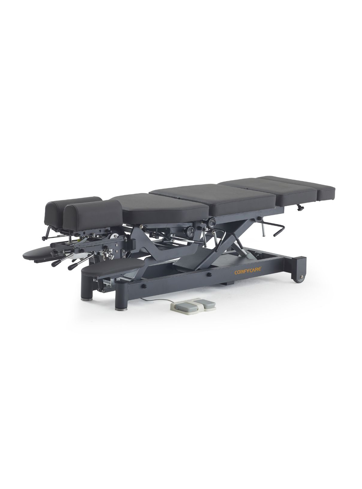 La superficie se organiza en 7secciones, incluyendo una separación abdominal que facilita elevar o descender la zona pectoral para posicionamientos más ergonómicos y técnicas específicas. Incorpora 3 drops (cervical, torácico y pélvico) que amplían las posibilidades terapéuticas y permiten ejecutar ajustes de forma precisa y segura. El cabezal, regulable tanto en altura como en apertura, junto con el reposapiés extensible, mejora la adaptación a diferentes morfologías de paciente.