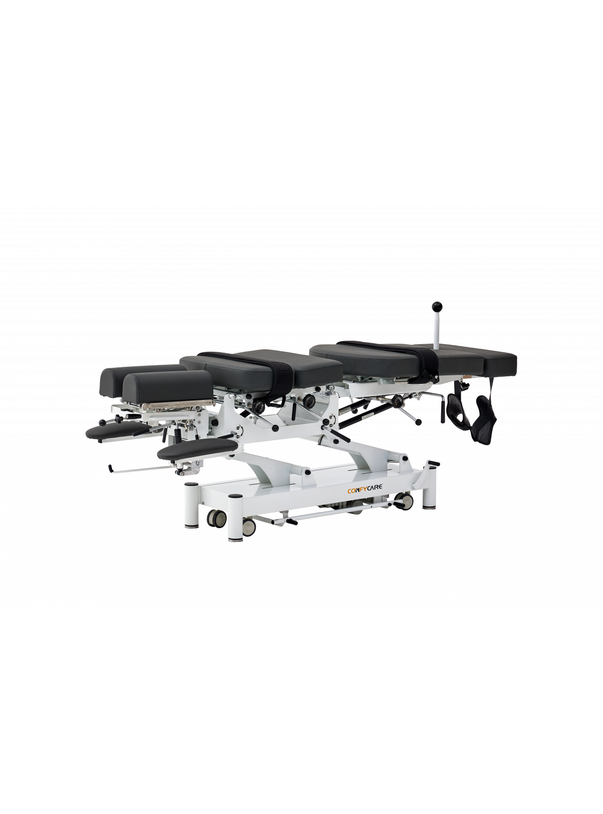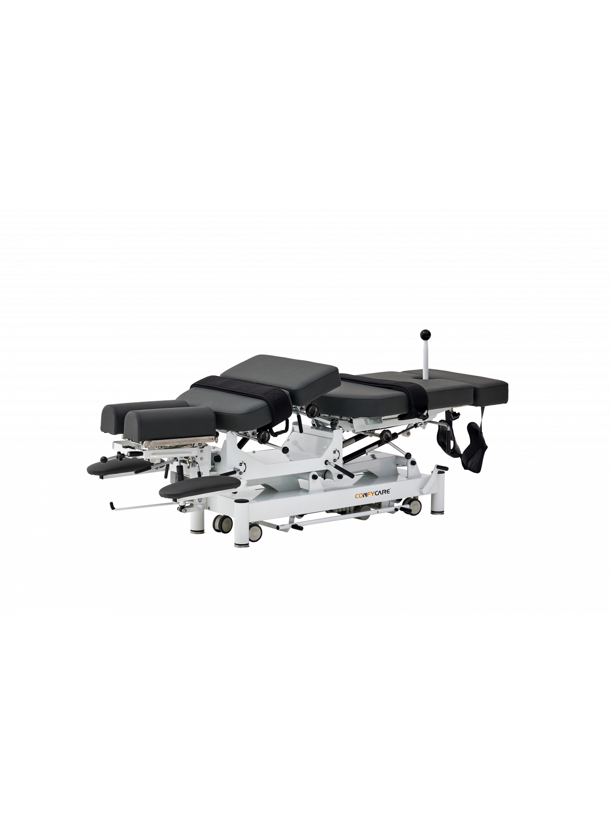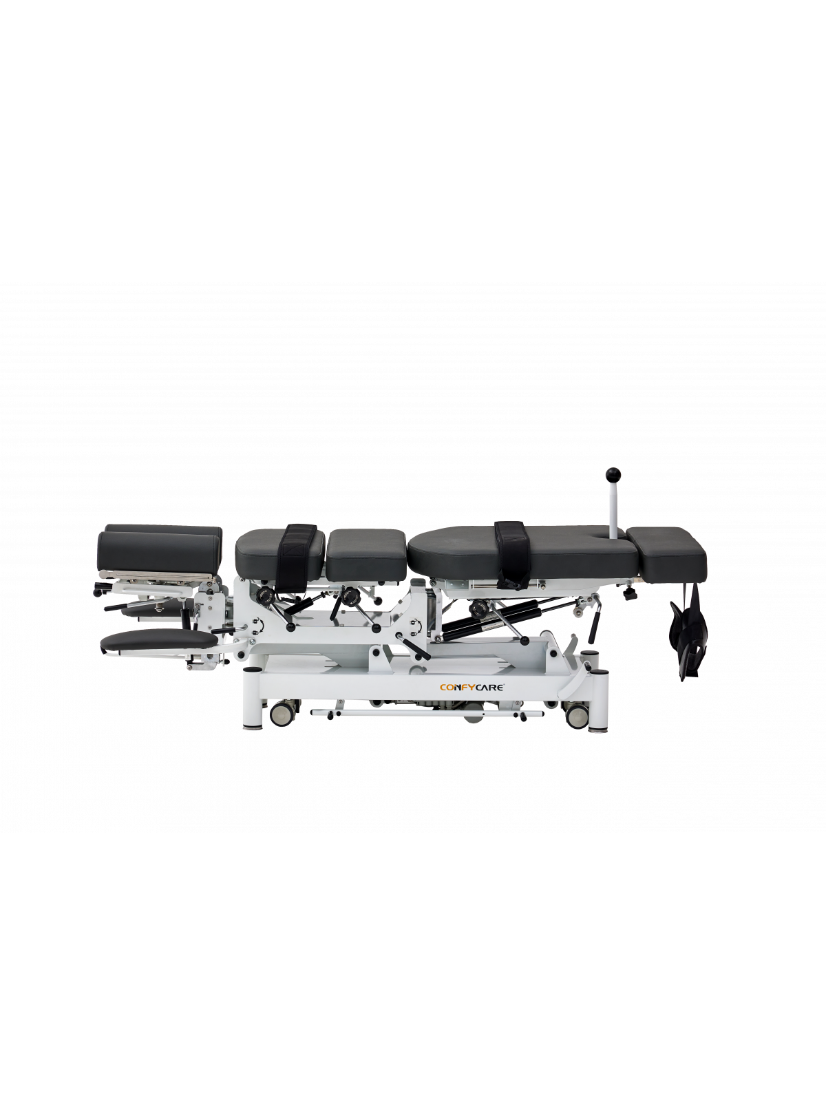 La camilla integra cuatro drops (cervical, torácico, lumbar y pélvico) que amplían el repertorio de ajustes y mejoran la eficacia del trabajo clínico. Su diseño con separación abdominal permite elevar o descender la sección torácica para facilitar posiciones específicas en flexión, distracción o movilizaciones avanzadas. En la zona inferior, la barra en T extraíble permite controlar la tensión vertical y la flexión horizontal, optimizando el trabajo en flexión-distracción lumbar.