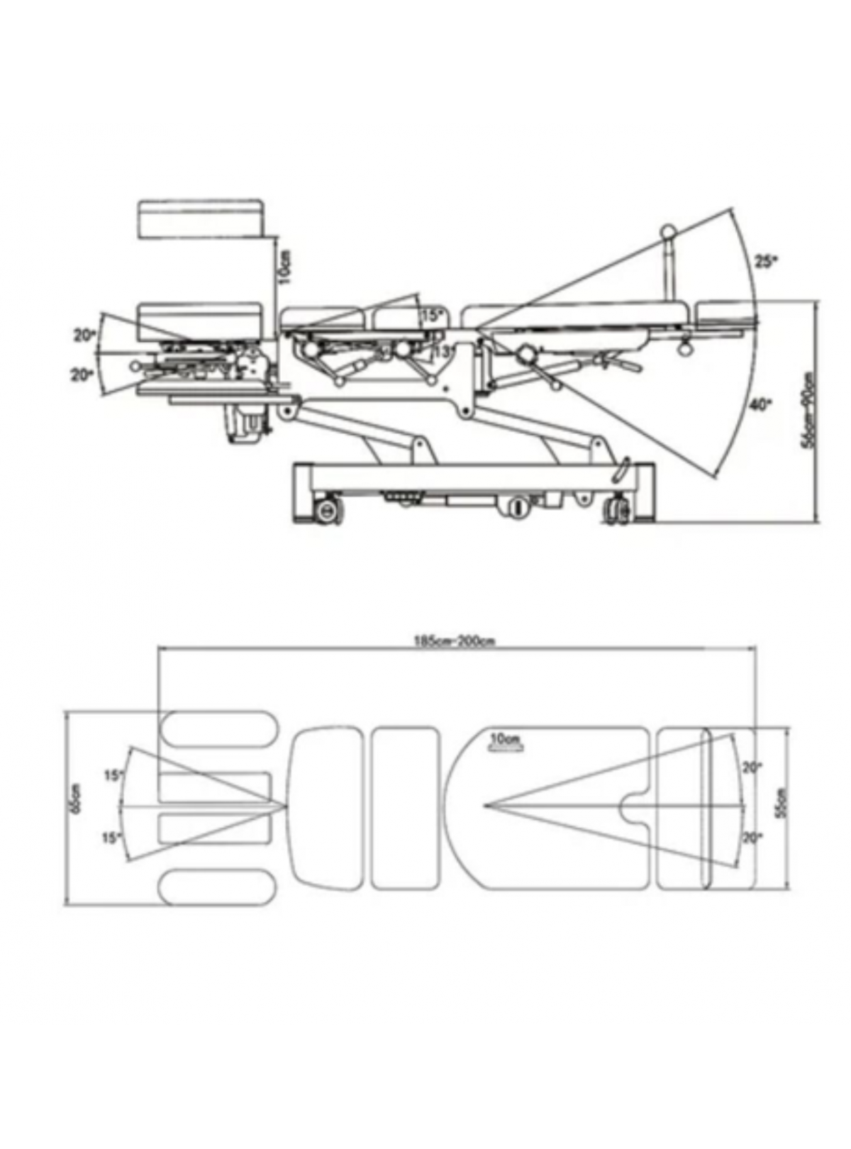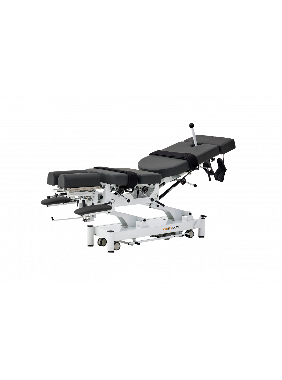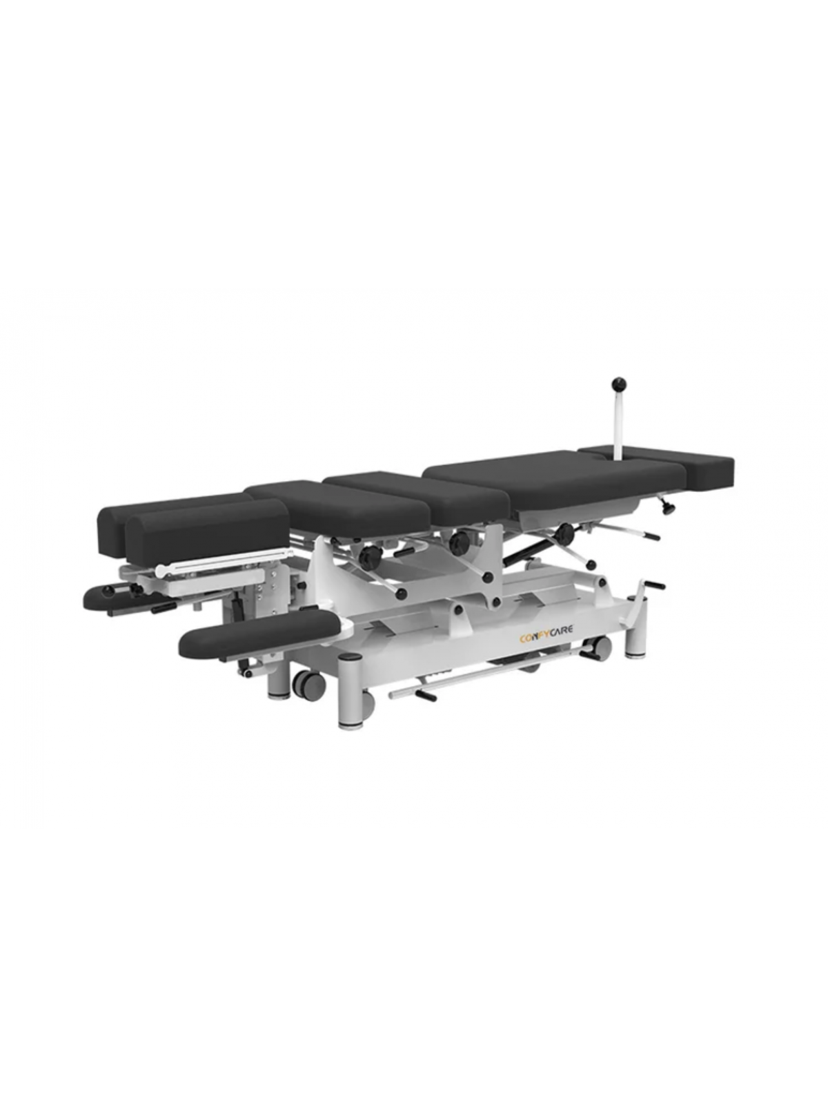 La camilla integra cuatro drops (cervical, torácico, lumbar y pélvico) que amplían el repertorio de ajustes y mejoran la eficacia del trabajo clínico. Su diseño con separación abdominal permite elevar o descender la sección torácica para facilitar posiciones específicas en flexión, distracción o movilizaciones avanzadas. En la zona inferior, la barra en T extraíble permite controlar la tensión vertical y la flexión horizontal, optimizando el trabajo en flexión-distracción lumbar.