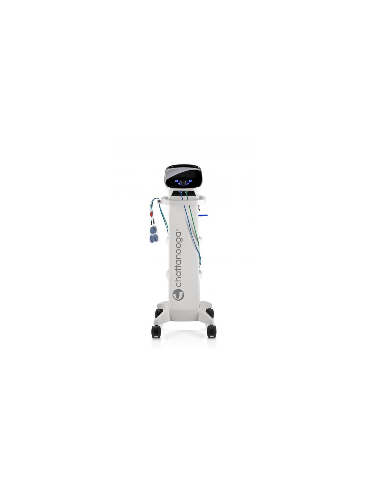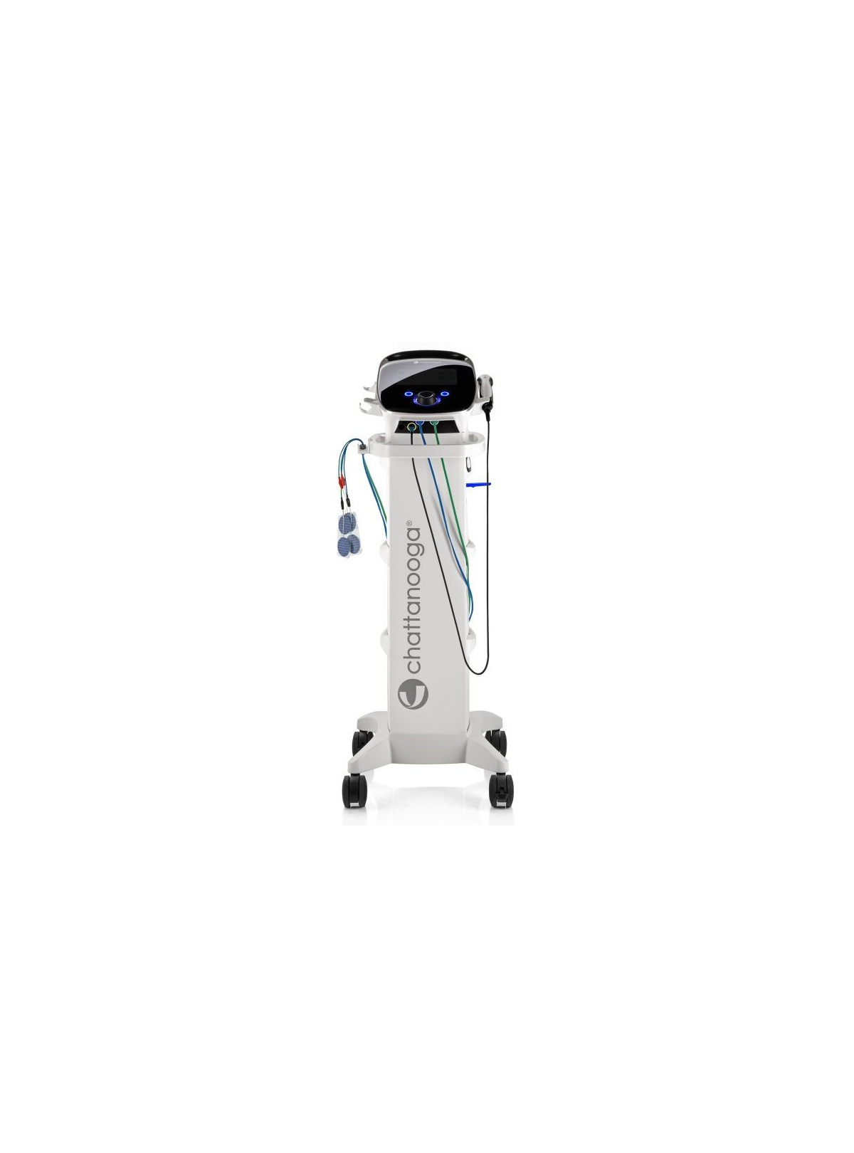 Su estructura integra soporte para la unidad terapéutica y espacio de almacenamiento para cables, electrodos, gel conductor, cinchas y otros materiales habituales, contribuyendo a un entorno de trabajo ordenado y seguro. El diseño permite además mantener ocultas las conexiones, mejorando la gestión del cableado durante la práctica clínica.