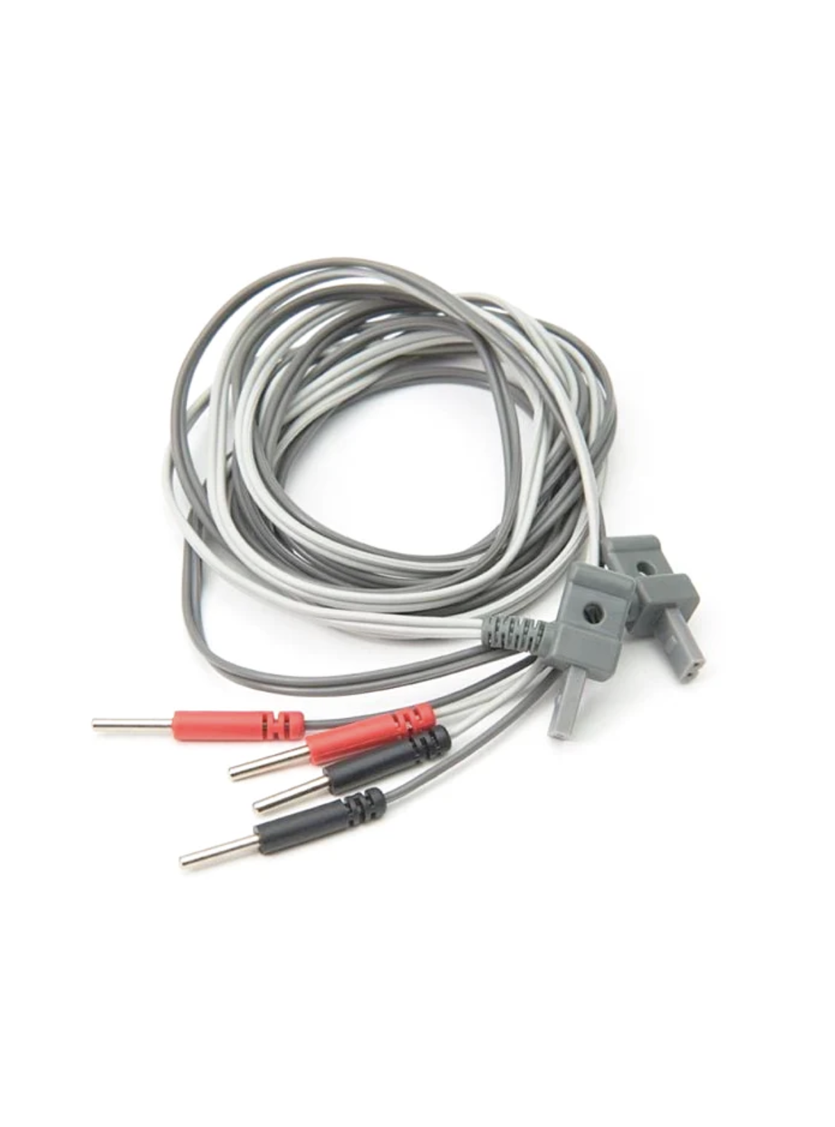 Set de dos cables bipolares con conectores banana de 2 mm, diseñados para ofrecer una conexión sólida y fiable entre el equipo y los electrodos en tratamientos de electroestimulación. Los colores negro y rojo permiten identificar visualmente los canales con facilidad, facilitando una colocación rápida y evitando confusiones durante las sesiones terapéuticas.