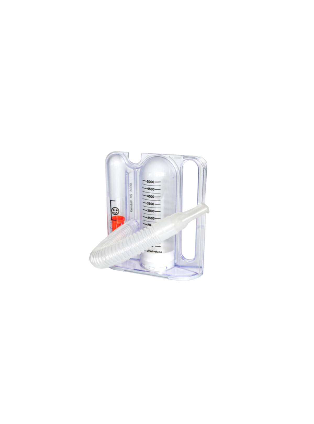 El dispositivo se compone de un cuerpo volumétrico transparente conectado a un tubo corrugado flexible y una boquilla ergonómica que mejora el confort durante el uso. Está especialmente indicado en programas de fisioterapia respiratoria, rehabilitación pulmonar y en la prevención y tratamiento de la atelectasia en pacientes postquirúrgicos o con patología respiratoria, permitiendo entrenar la capacidad pulmonar de forma segura, progresiva y controlada.