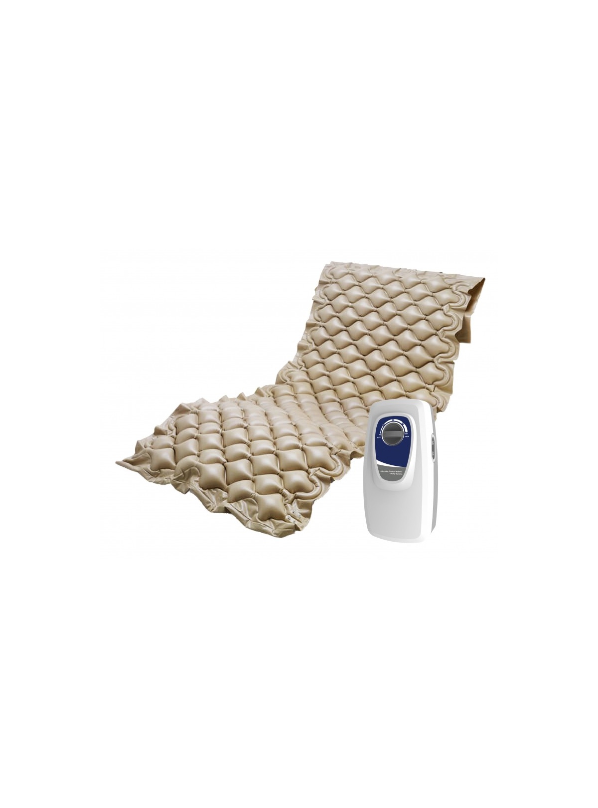 El colchón está fabricado en PVC médico y cuenta con 130 celdas alternantes que se inflan y desinflan secuencialmente, generando un micro masaje que reduce la presión mantenida sobre la piel, favorece el flujo sanguíneo y mantiene los tejidos oxigenados. Mide aproximadamente 200 cm de largo por 90 cm de ancho, con celdas infladas de 7,6 cm de altura y solapas laterales de 50 cm que permiten fijarlo fácilmente bajo el colchón sin desplazamientos. Es resistente, lavable y apto para un uso diario continuado.