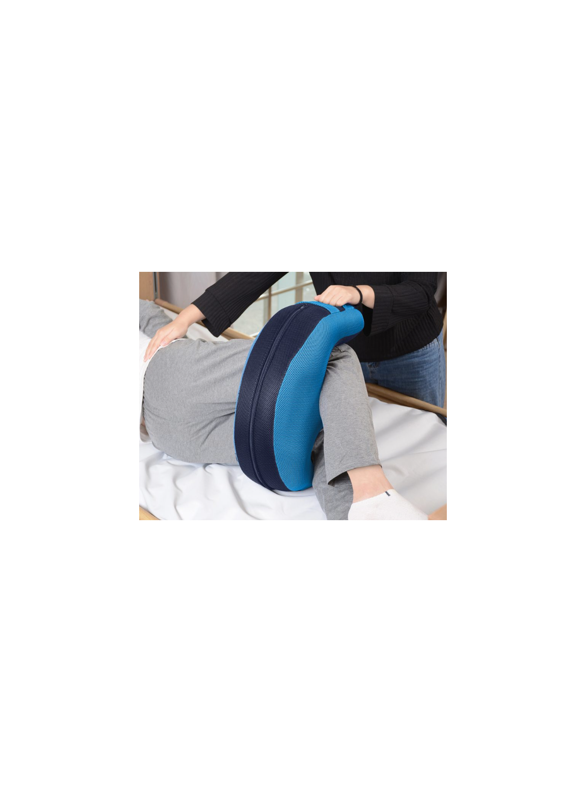 La funda exterior, confeccionada en poliéster, es completamente extraíble y lavable para asegurar higiene y mantenimiento sencillo. Gracias a su forma envolvente, el cojín es suave y confortable para el paciente, evitando presiones localizadas durante el movimiento.