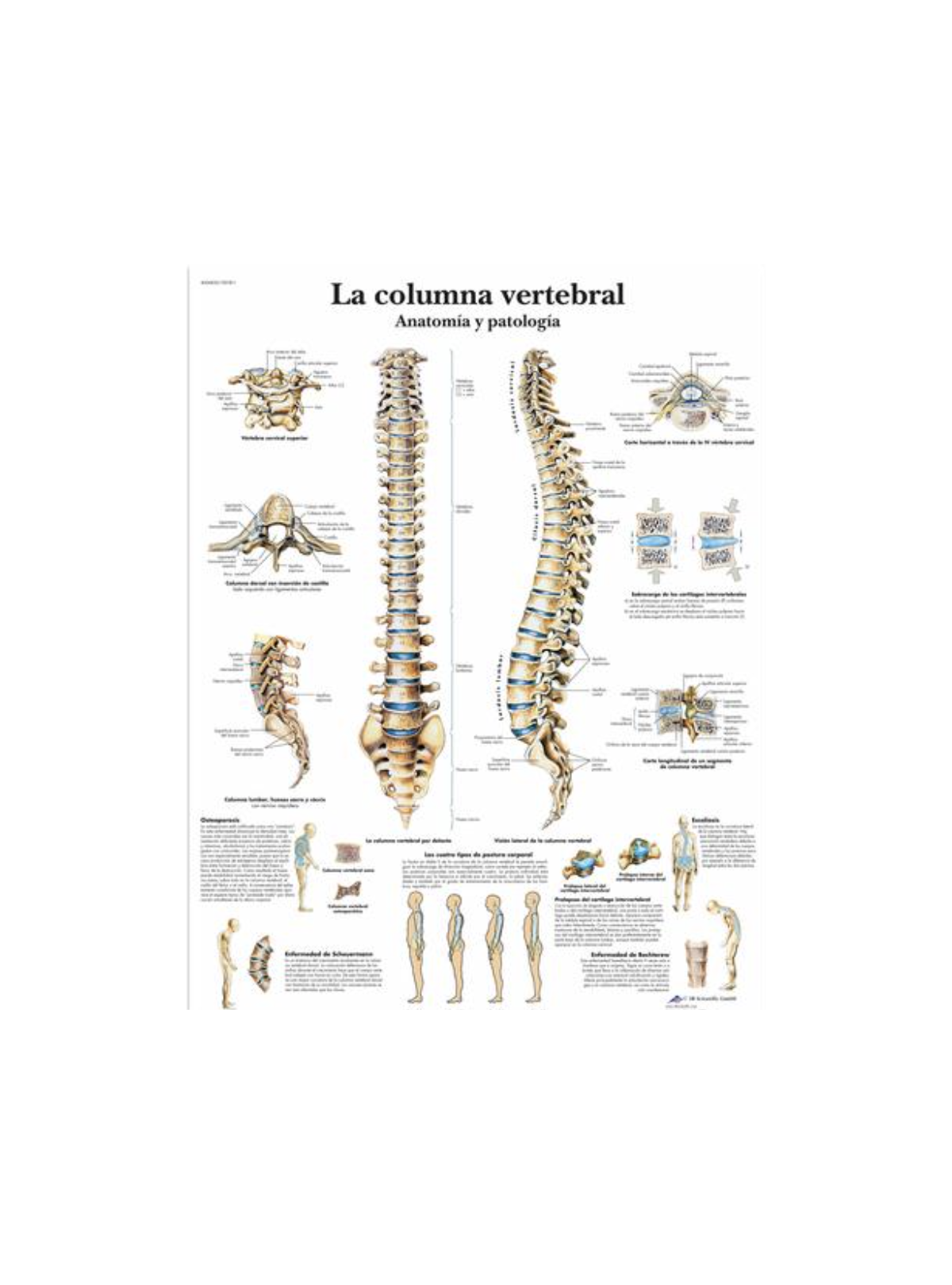 Explora la columna vertebral con precisión clínica gracias a esta lámina anatómica en gran formato (50 × 67 cm), diseñada para un uso didáctico y sanitario. Presenta la estructura completa de la columna en vistas frontal y lateral, detallando vértebras cervicales, dorsales, lumbares, sacro y coxis, así como discos intervertebrales y curvaturas fisiológicas.