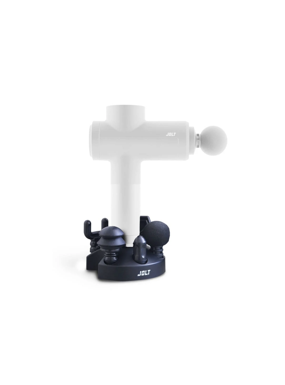 La Base de Carga y Almacenamiento Jolt™ ha sido diseñada para que su pistola de masaje Jolt™ Bolt+ esté siempre cargada, accesible y perfectamente organizada. Es una solución ideal para profesionales que trabajan con un elevado flujo de pacientes, así como para usuarios que desean tener su dispositivo siempre preparado sin necesidad de buscar cables o cabezales sueltos.