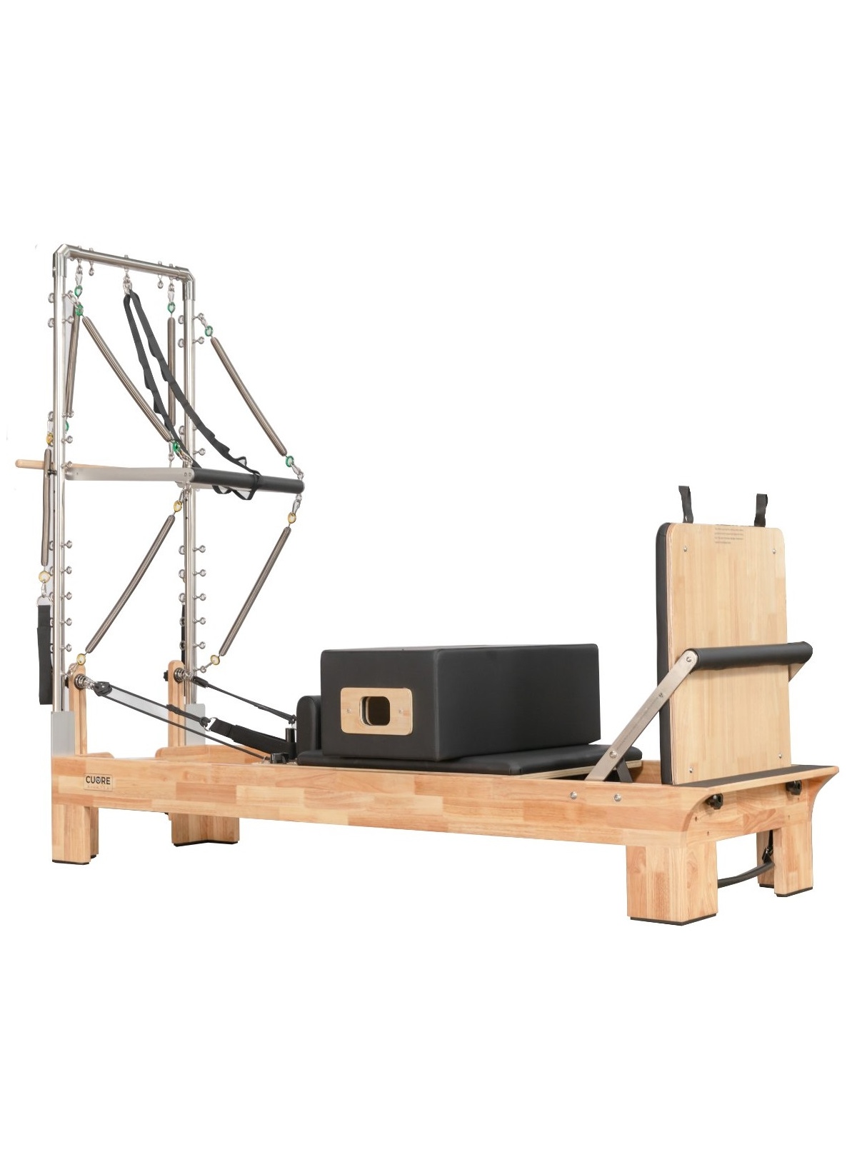 Su diseño integra la funcionalidad del reformer clásico con una torre vertical completa que permite añadir poleas, barras y muelles adicionales para ampliar el repertorio de ejercicios. El carro incluye un sistema de muelles regulables en altura e intensidad, con tres niveles de resistencia (dos rojos fuertes, dos verdes medios y dos amarillos ligeros), mientras que la barra de pies ajustable en siete posiciones, el cabezal regulable en tres niveles, las poleas con cinco alturas distintas y las hombreras extraíbles e intercambiables con dos opciones de separación aseguran una experiencia versátil y adaptable a distintos usuarios.