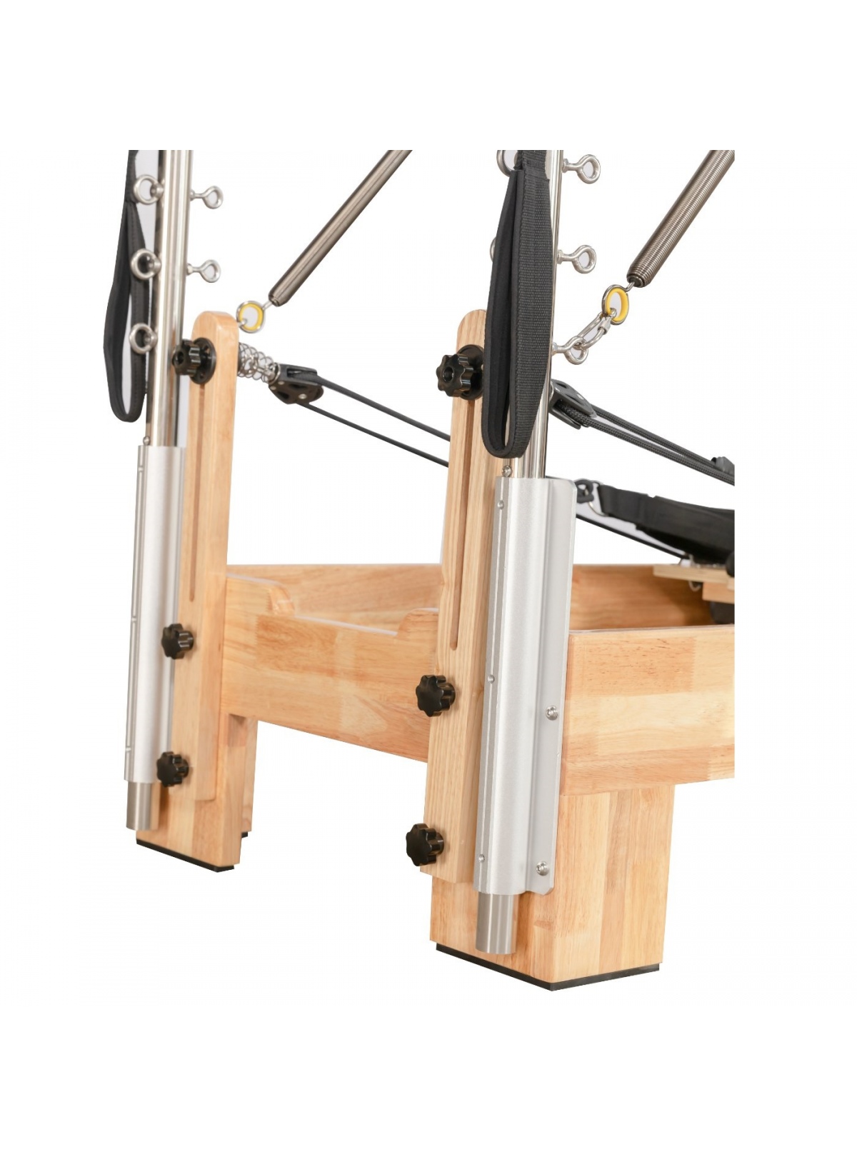 El Reformer con Torre de Madera es un equipo profesional diseñado para ampliar al máximo las posibilidades de entrenamiento del método Pilates. Fabricado en madera maciza de roble, combina robustez, estabilidad y elegancia, con un acolchado de espuma EVA de alta densidad tapizado en polipiel negra lavable y resistente que asegura comodidad y durabilidad incluso en un uso intensivo. Con unas dimensiones de 232 × 70 × 210 cm y un peso de 130 kilos, se presenta como una máquina sólida y preparada para el trabajo diario en estudios y centros especializados.