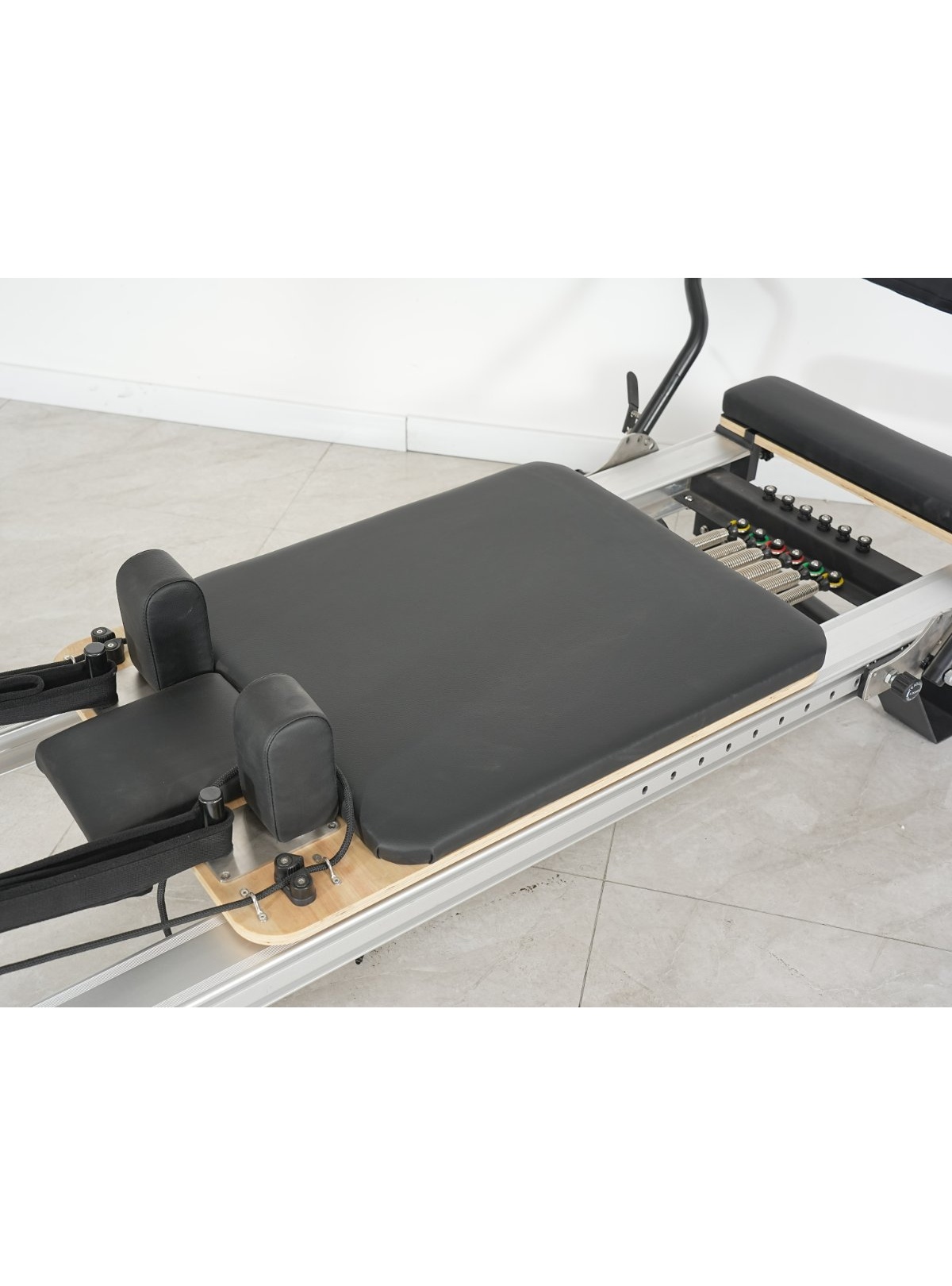 El equipo incluye un set completo de accesorios de reformer: asas dobles para manos y pies, plataforma de pies con superficie antideslizante, cinta de estabilidad, box o cajón, mat para convertir el reformer en camilla de ejercicios de suelo, tabla de salto y tabla de extensión mat acolchada.