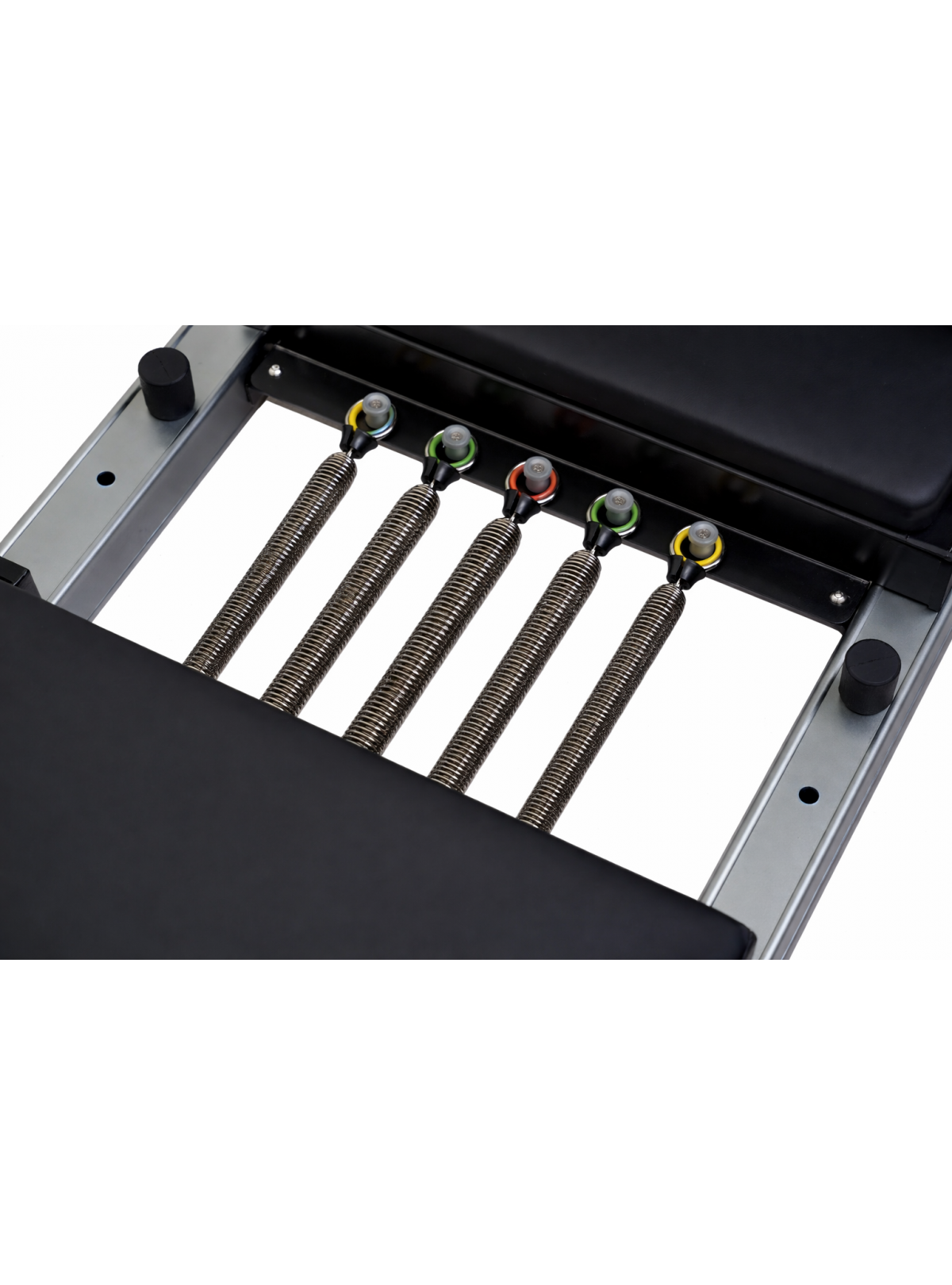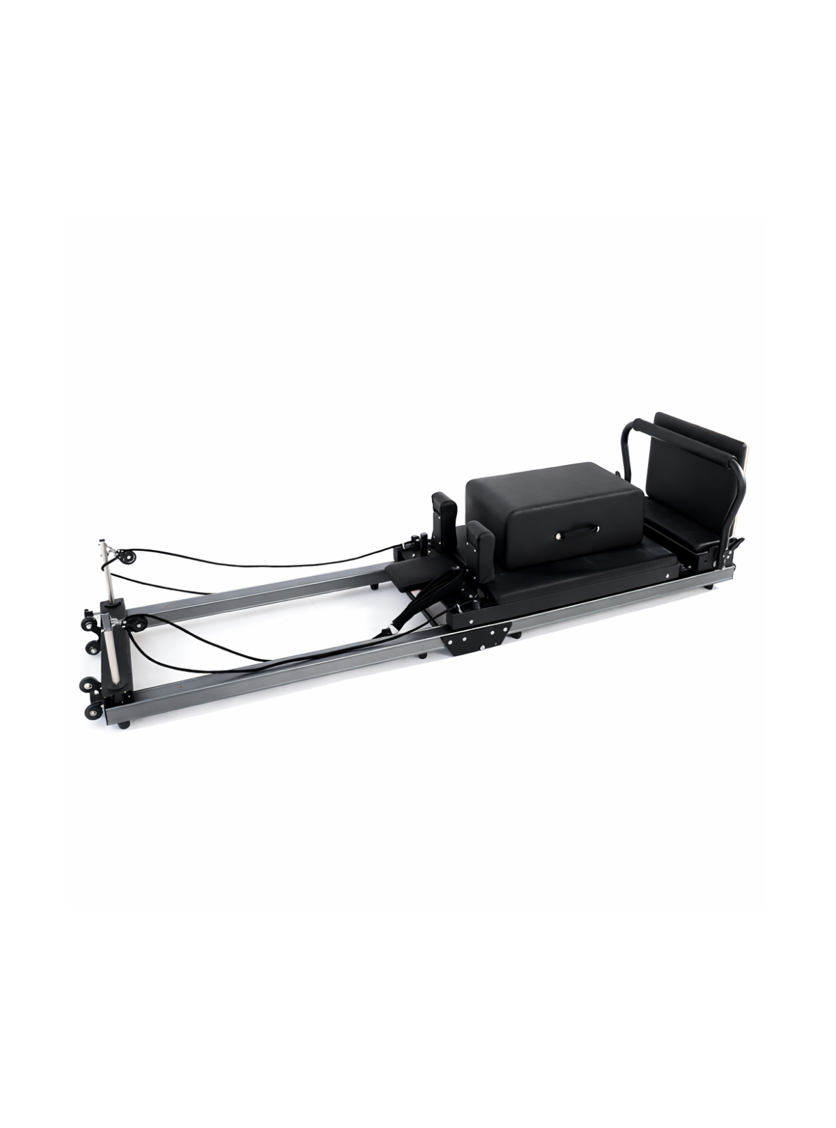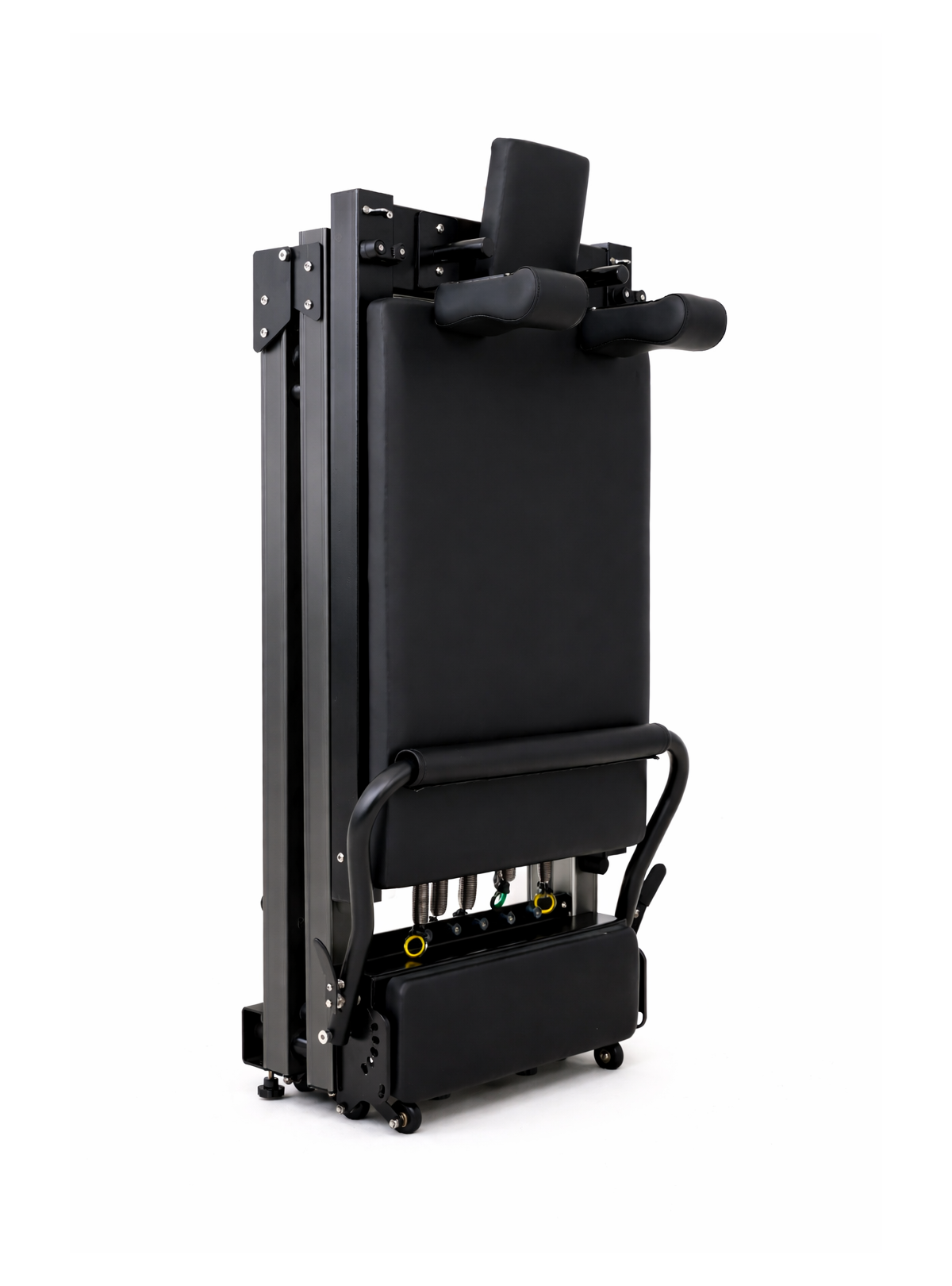 El Reformer Plegable Profesional de Madera ofrece la misma calidad y resistencia que un modelo fijo, con la ventaja de un diseño compacto que se pliega fácilmente para optimizar espacio en estudios profesionales.