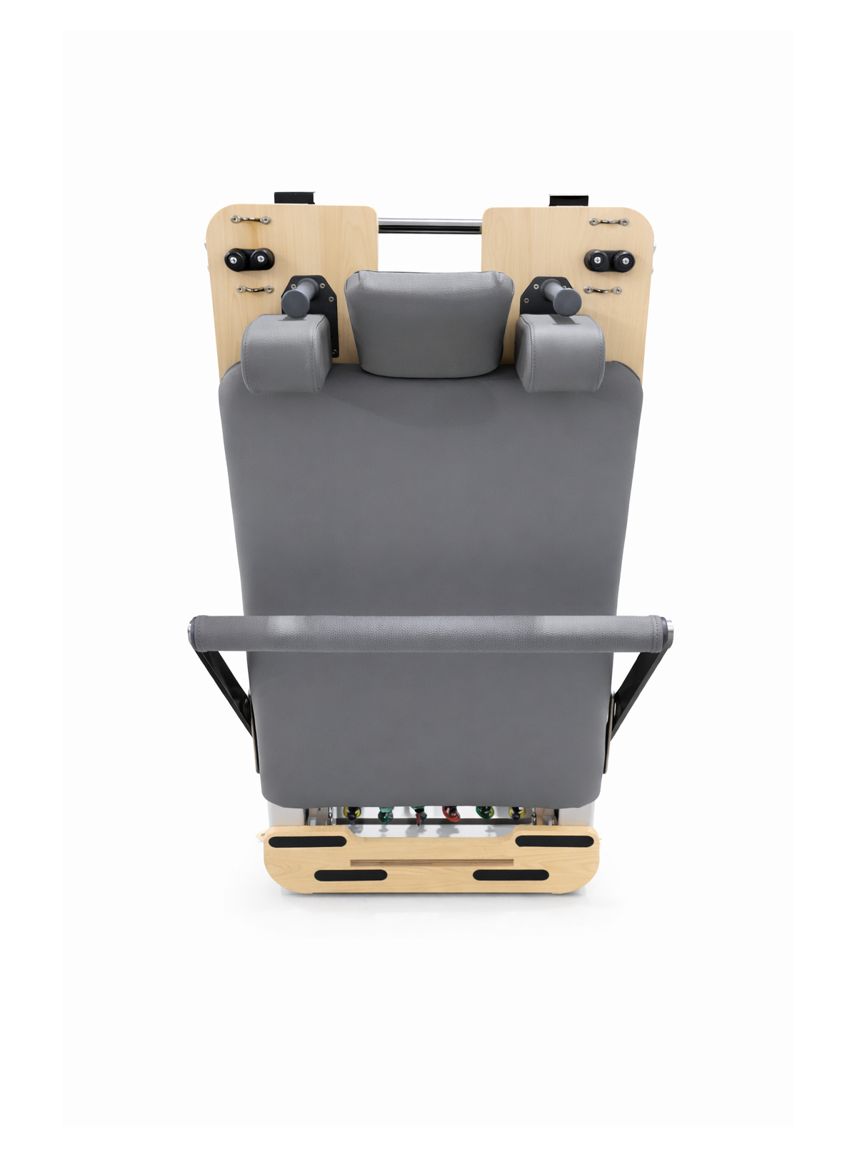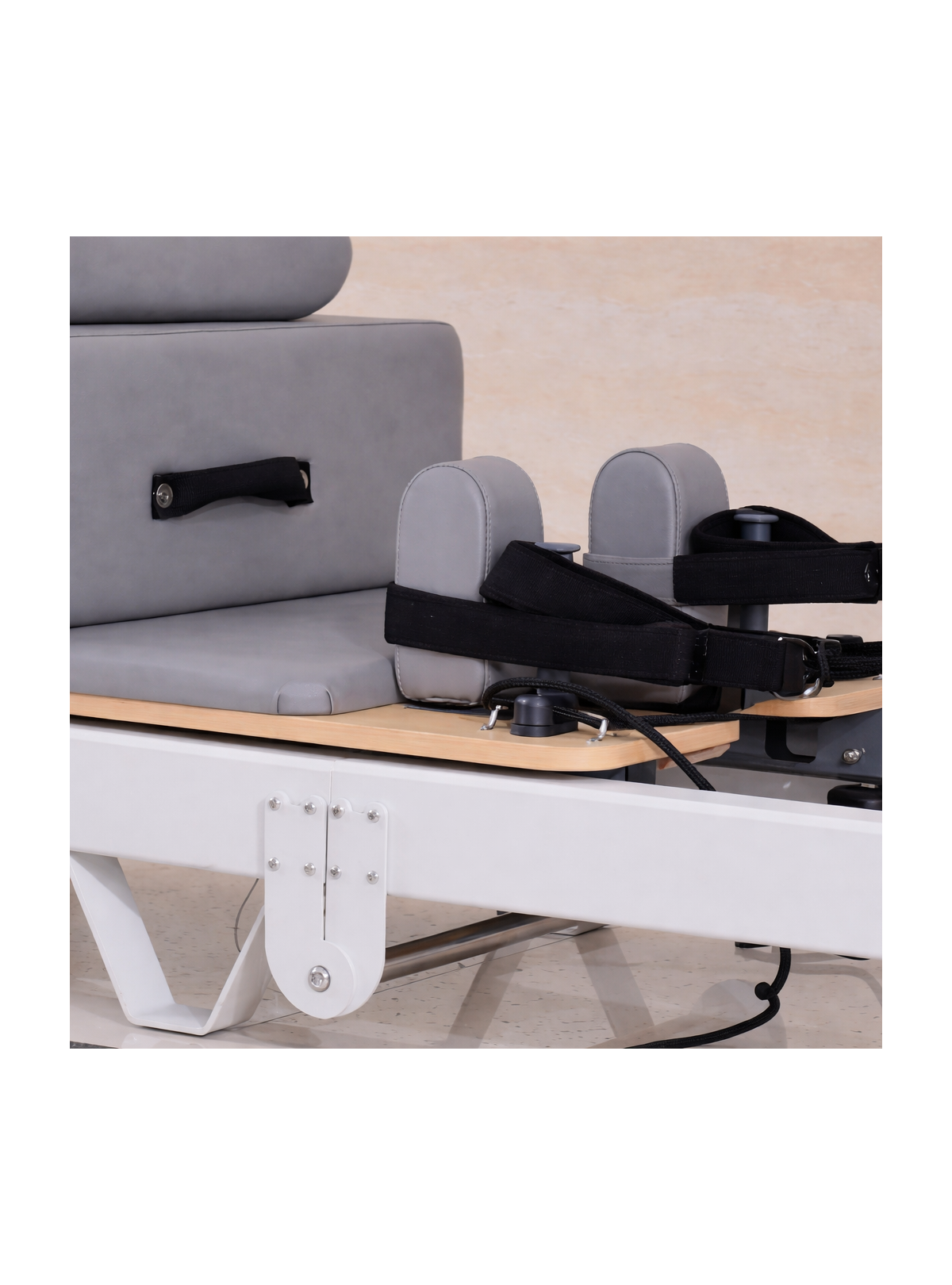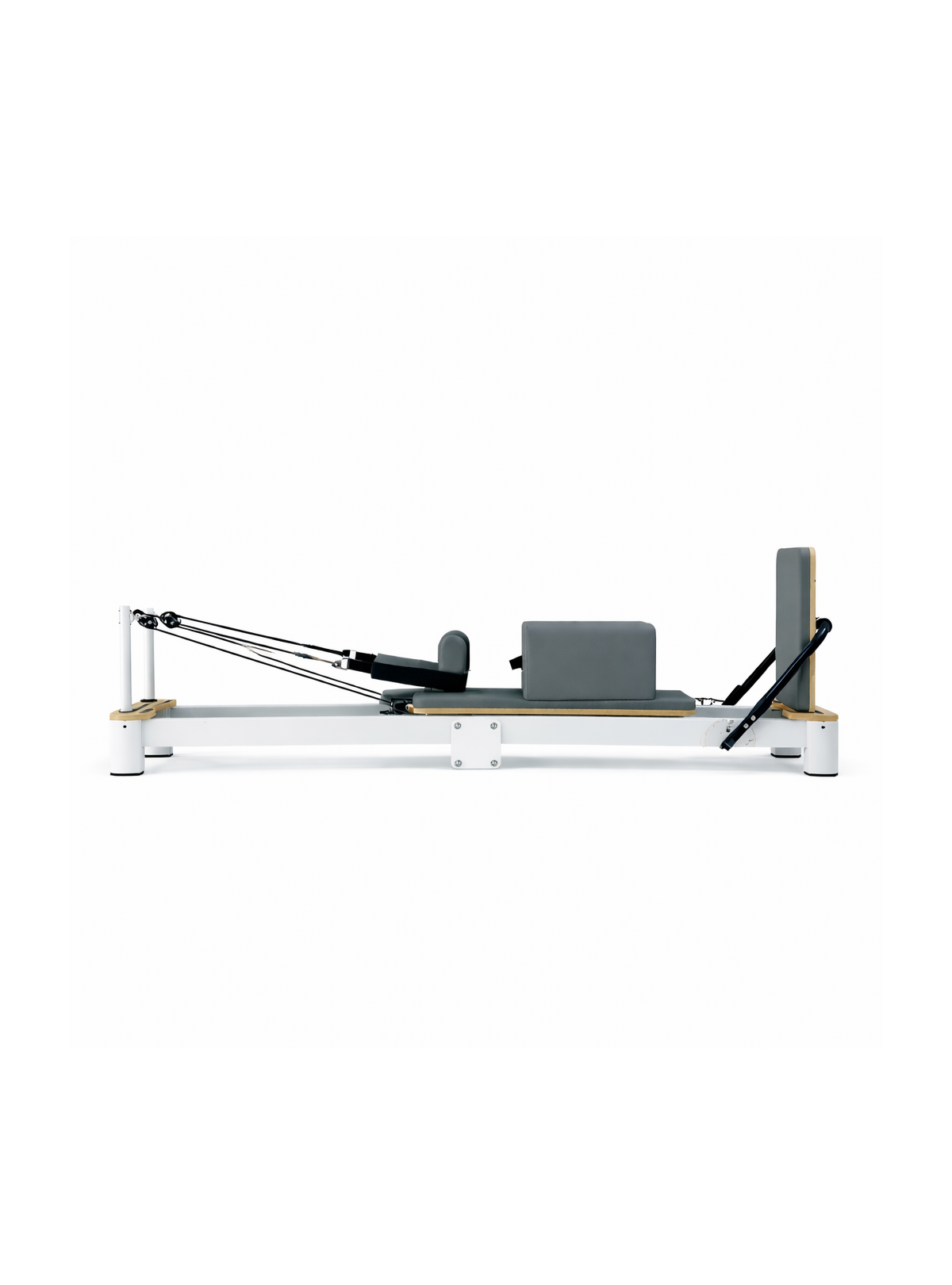 El Reformer Plegable Profesional de Madera ofrece la misma calidad y resistencia que un modelo fijo, con la ventaja de un diseño compacto que se pliega fácilmente para optimizar espacio en estudios profesionales.
