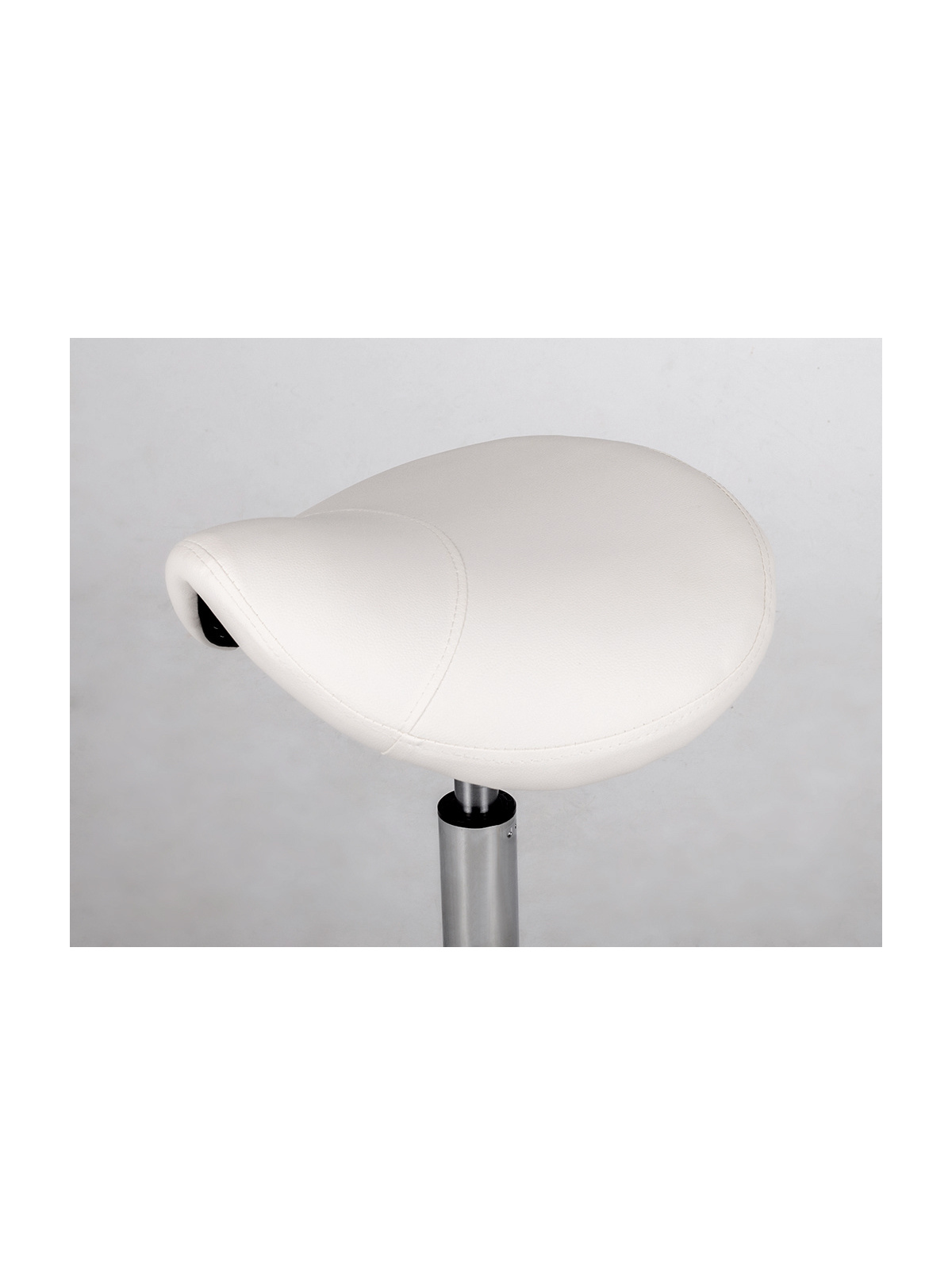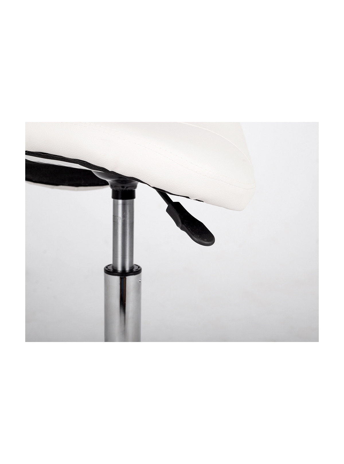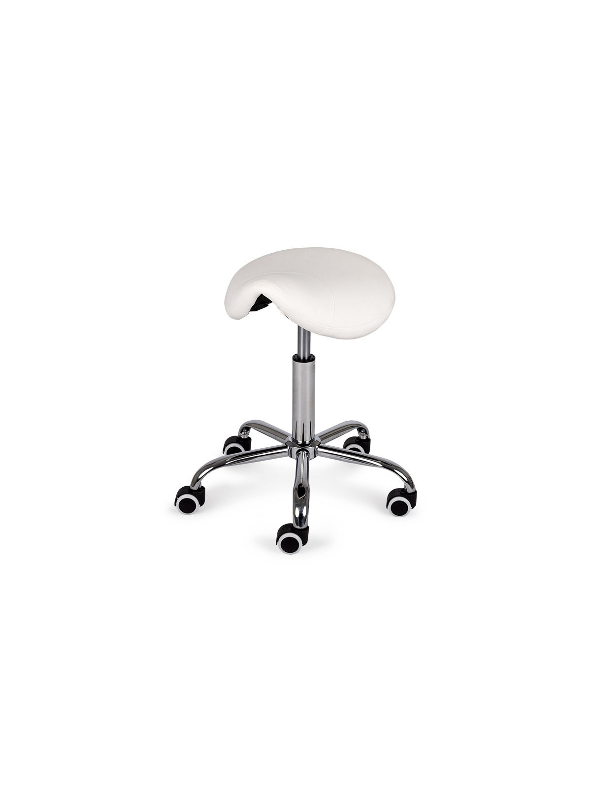 Taburete tipo silla de montar, ergonómico y regulable, con base cromada y tapizado resistente.