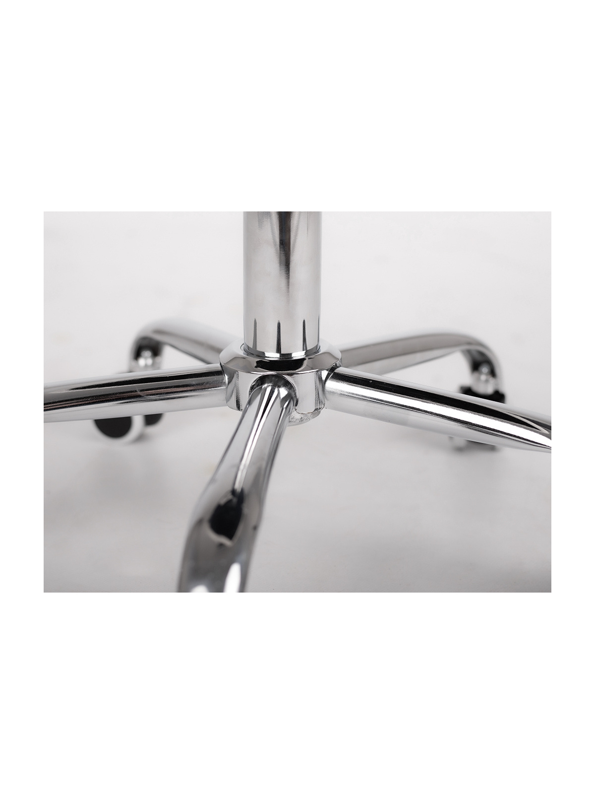 Cuenta con una base metálica cromada de cinco radios que añade un toque elegante al entorno, además de ofrecer gran estabilidad. Las ruedas incorporan una capa de poliuretano que permite un desplazamiento suave y silencioso, cuidando al mismo tiempo el suelo. La altura se ajusta fácilmente mediante pistón de gas, con un rango que va desde los 47 a los 61,5 cm, adaptándose a distintas necesidades.