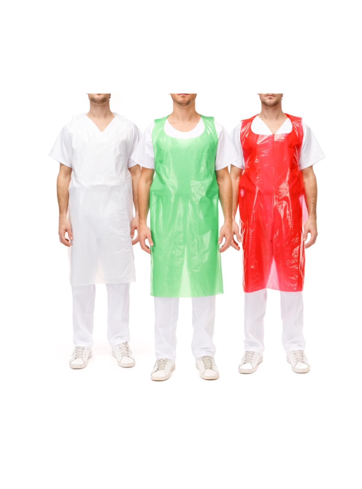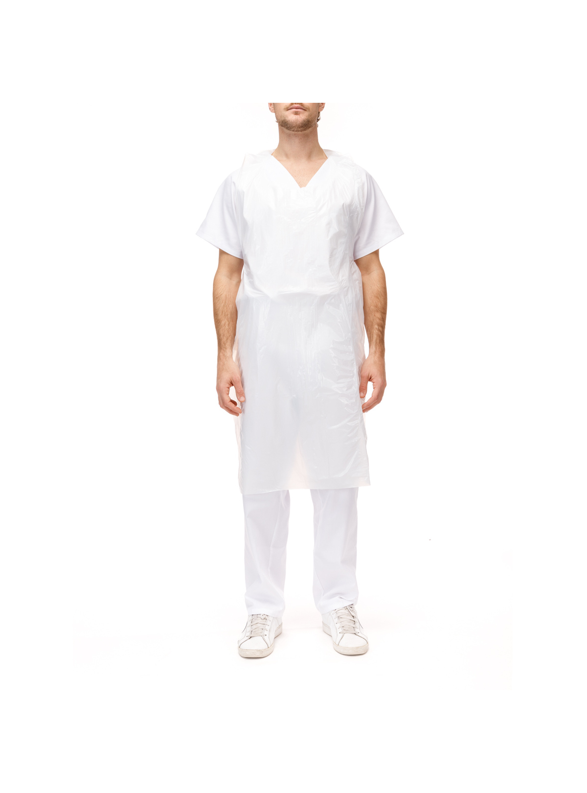 Delantal desechable fabricado en polietileno LDPE de 20 micras, diseñado para proporcionar protección frontal frente a salpicaduras, suciedad y contaminantes en entornos sanitarios, clínicos, estéticos o alimentarios. Su material impermeable y ligero actúa como barrera eficaz en procedimientos no estériles y tareas de higiene o manipulación.